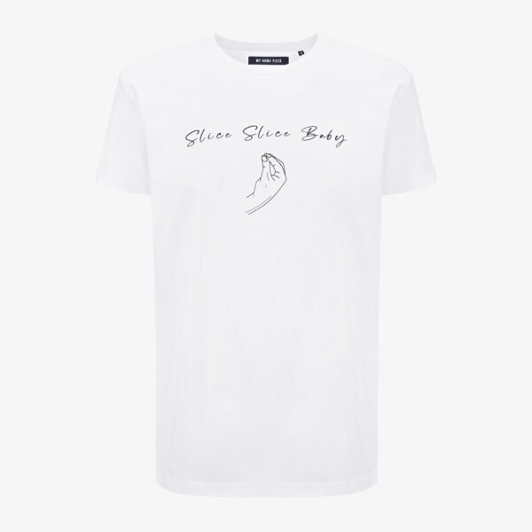 T-shirt z napisem “slice slice baby” na przodzie z tyłu logo myhomepizza
