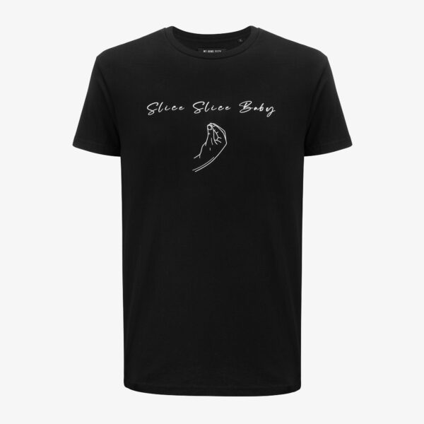 T-shirt z napisem “slice slice baby” na przodzie z tyłu logo myhomepizza